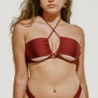 Élégant et audacieux, le haut Naïade sublime la silhouette avec son jeu de découpes et de liens croisés. Sa matière satinée au fini lumineux capte la lumière et met en valeur le bronzage.